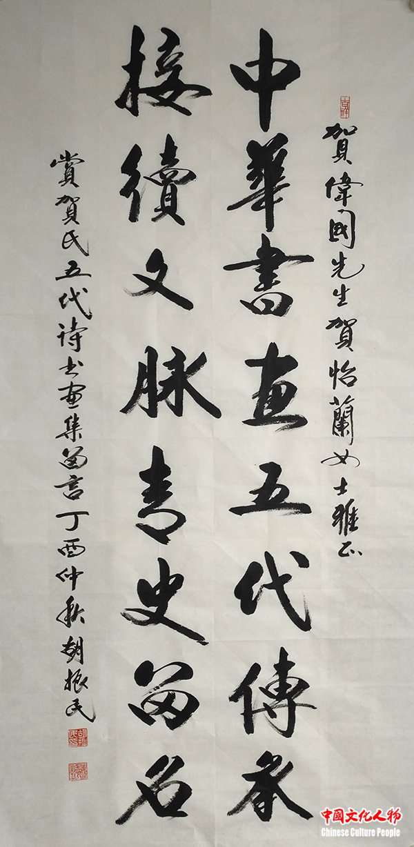 中国文联原党组书记胡振民为贺氏五代题写对联:“中华书画五代传承 接续文脉青史留名”