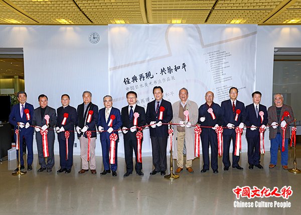 日本著名画家藤岛博文,著名表演艺术家唐国强,著名歌唱家关牧村,日本东洋书道艺术学会理事长松本啓祐,“经典再现·共筑和平”中国艺术家代表团秘书长刘哲等出席开幕式的中日两国艺术家及嘉宾祝贺展览圆满成功