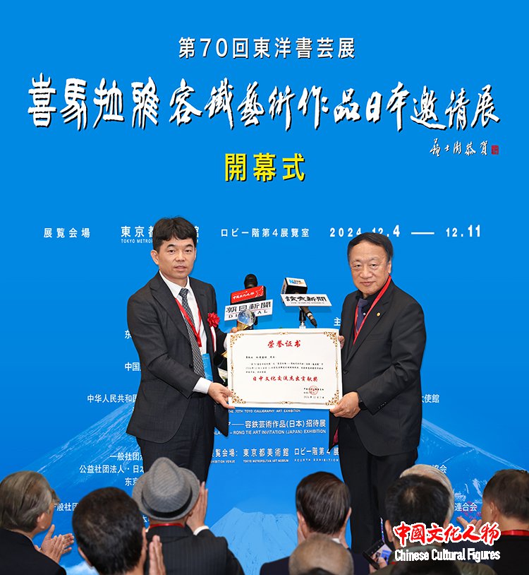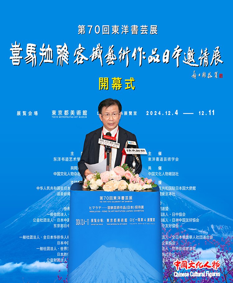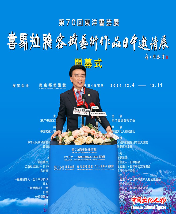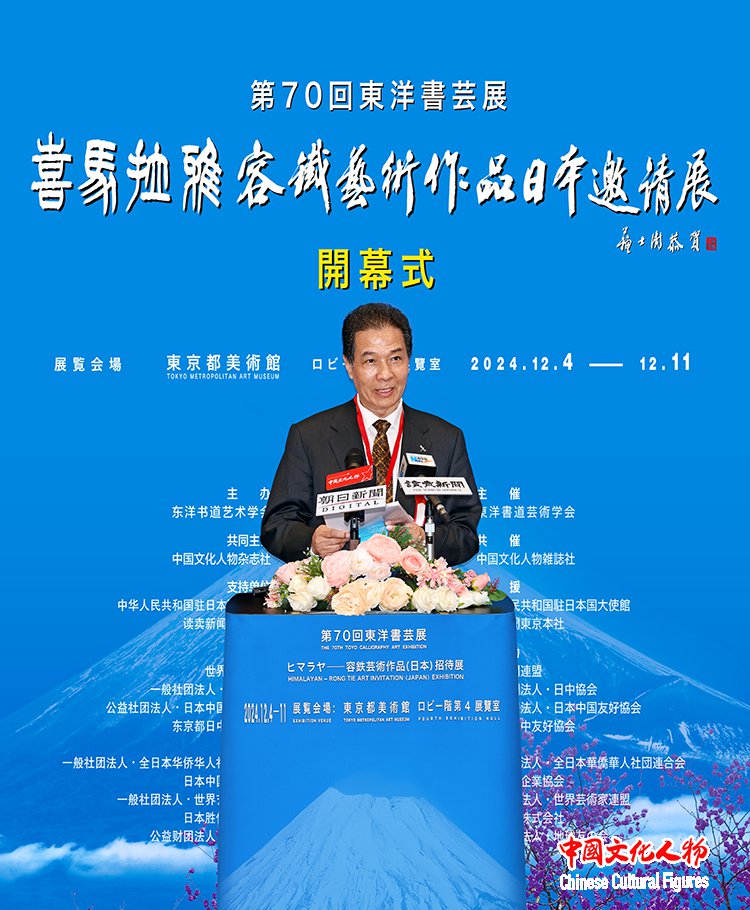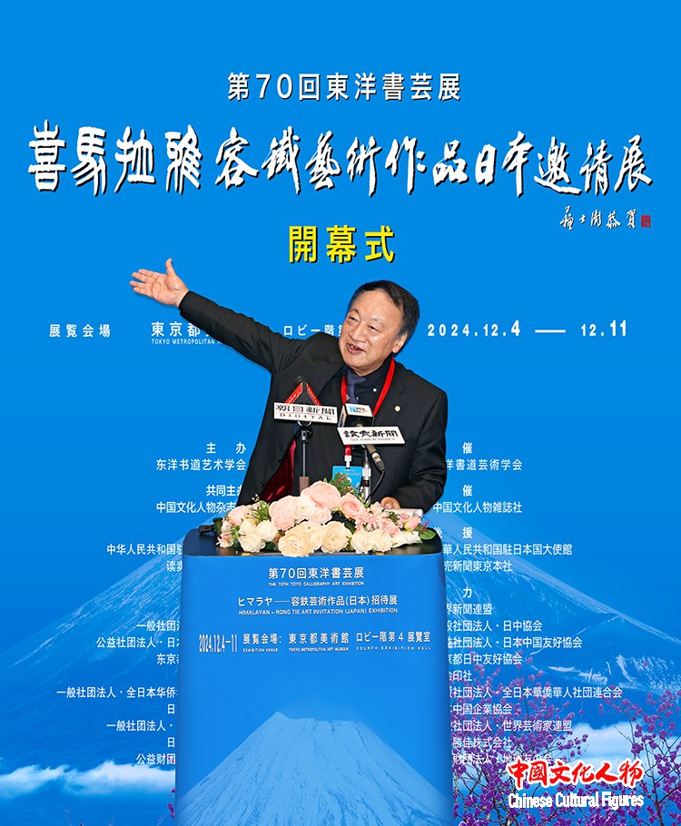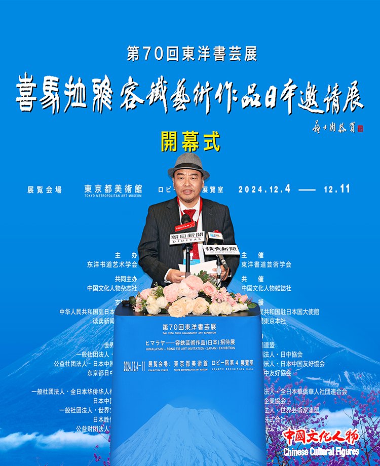由东洋书道艺术学会主办,中国文化人物杂志社共同主办,中国驻日本国大使馆、读卖新闻东京总社支持,世界新闻联盟、一般社团法人日中协会、公益社团法人日中友好协会、东京都日中友好协会、西泠印社、一般社团法人全日本华侨华人社团联合会、日本中国企业协会、一般社团法人世界艺术家联盟、日本胜佳株式会社、公益财团法人地球之友等单位协办的“第70届东洋书艺展——喜马拉雅——容铁艺术作品(日本)邀请展”开幕式于12月7日在日本东京都美术馆隆重举行