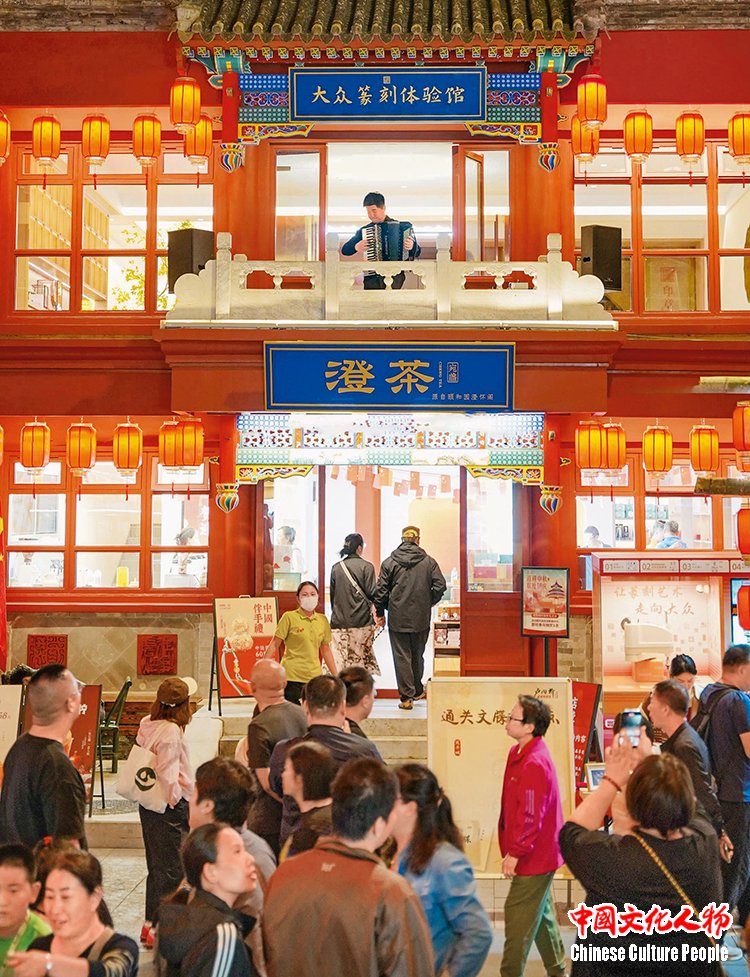 宛平城澄茶店的小舞台手风琴表演引来游客驻足欣赏