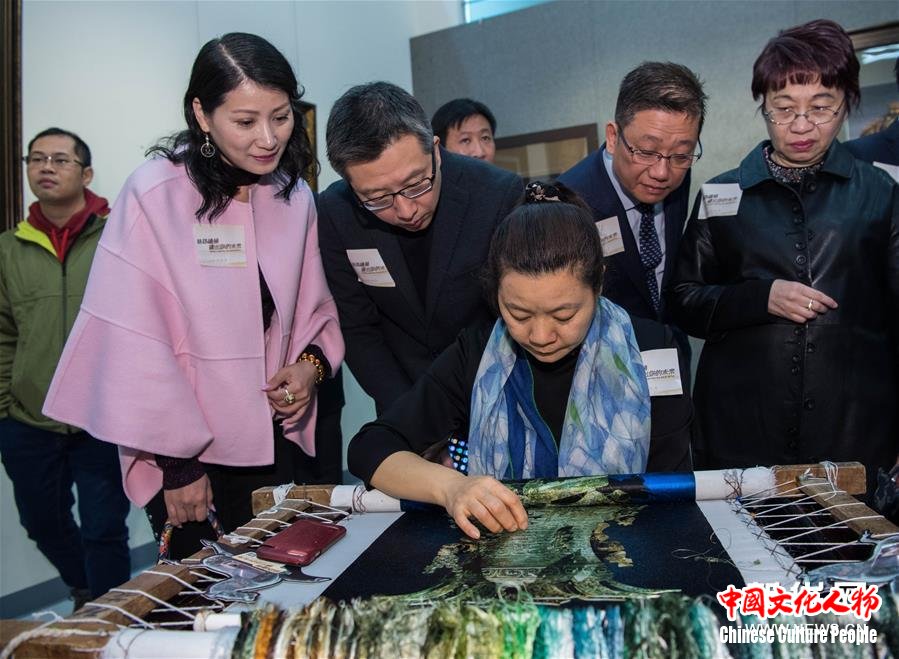 1月4日,嘉宾在参观展出的绣品。当日,“丝路绣韵·绣出你的未来”中国丝绸之路艺术精品粤港澳巡展(澳门站)在澳门教科文中心举行。展览展出32幅苏绣珍品。 新华社记者张金加 摄
