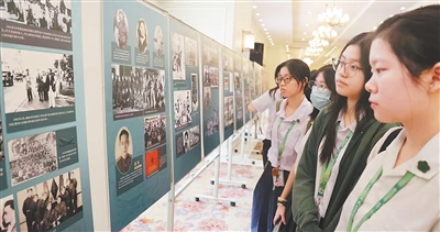 观众参观中国驻菲律宾大使馆举办的“纪念中国人民抗日战争暨世界反法西斯战争胜利80周年”主题图片展。 本报记者 樊 帆摄