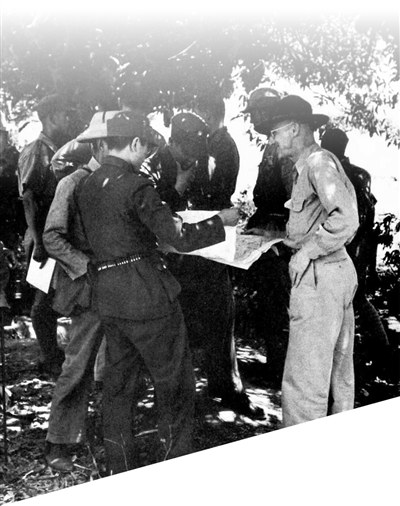 史迪威将军(右一)与中国远征军将领在缅甸同古前线。 中国人民抗日战争纪念馆供图