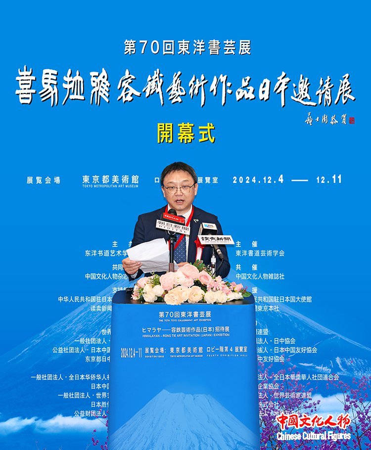 由东洋书道艺术学会主办,中国文化人物杂志社共同主办,中国驻日本国大使馆、读卖新闻东京总社支持,世界新闻联盟、一般社团法人日中协会、公益社团法人日中友好协会、东京都日中友好协会、西泠印社、一般社团法人全日本华侨华人社团联合会、日本中国企业协会、一般社团法人世界艺术家联盟、日本胜佳株式会社、公益财团法人地球之友等单位协办的“第70届东洋书艺展——喜马拉雅——容铁艺术作品(日本)邀请展”开幕式于12月7日在日本东京都美术馆隆重举行