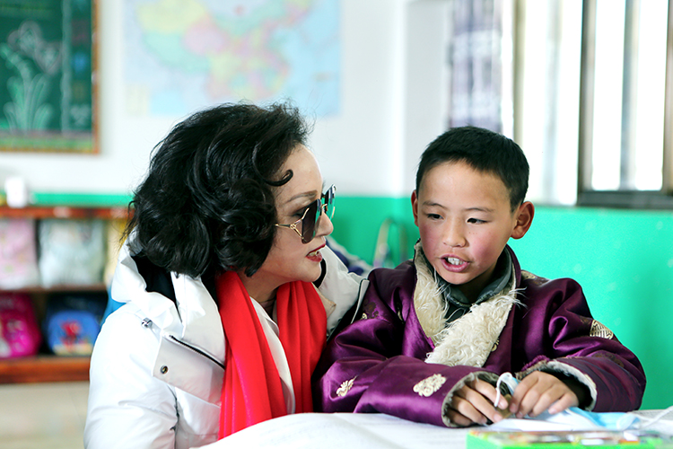 中国公益事业形象大使马彩青与藏族学生亲切交谈